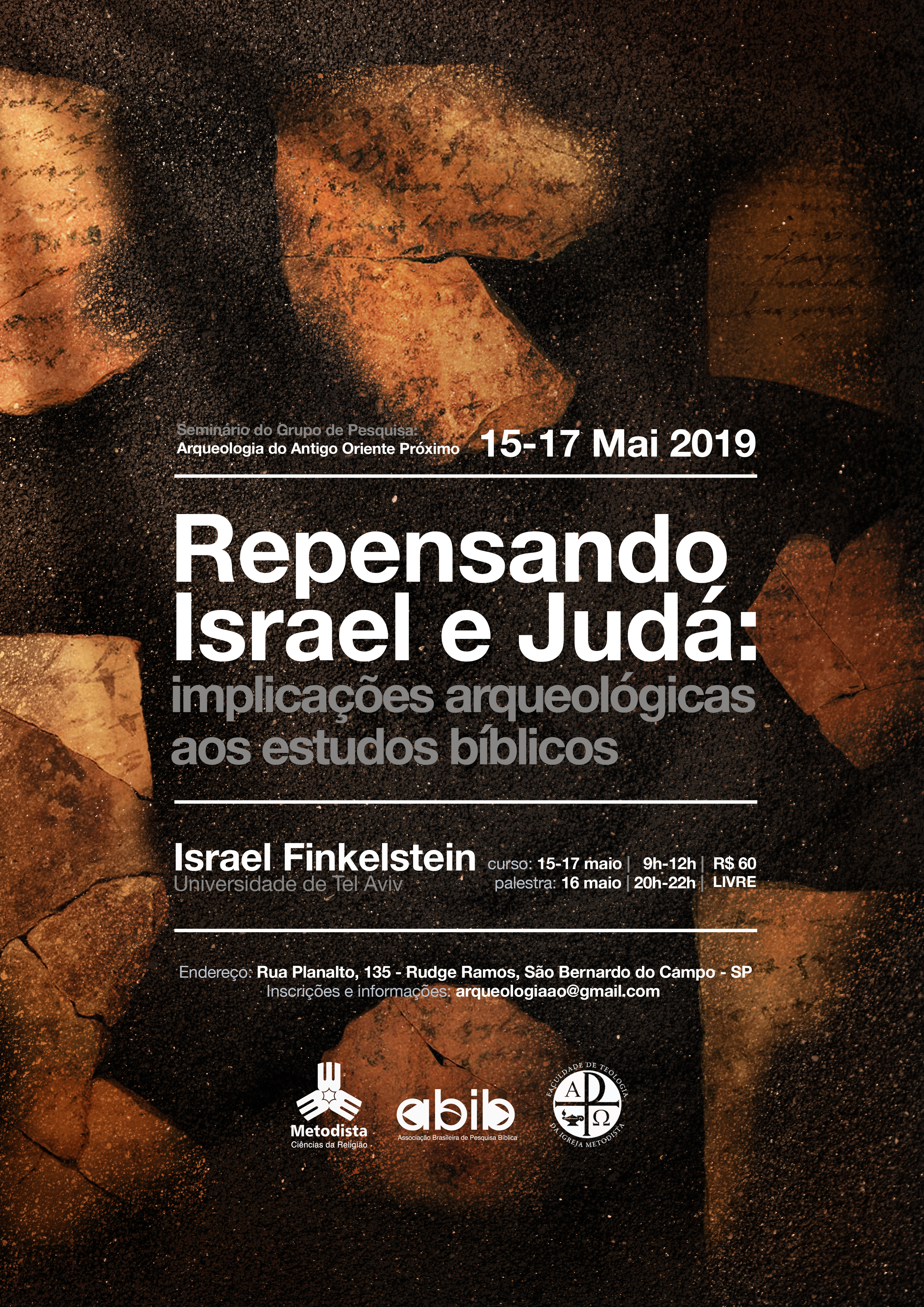O grupo de pesquisa Arqueologia do Antigo Oriente Próximo, o Programa de Pós-graduação em Ciências da Religião, a Faculdade de Teologia da Igreja Metodista e a Associação Brasileira de Pesquisa Bíblica promovem entre 15 e 17 de maio o curso de extensão "Repensando Israel e Judá: implicações arqueológicas aos estudos bíblicos".