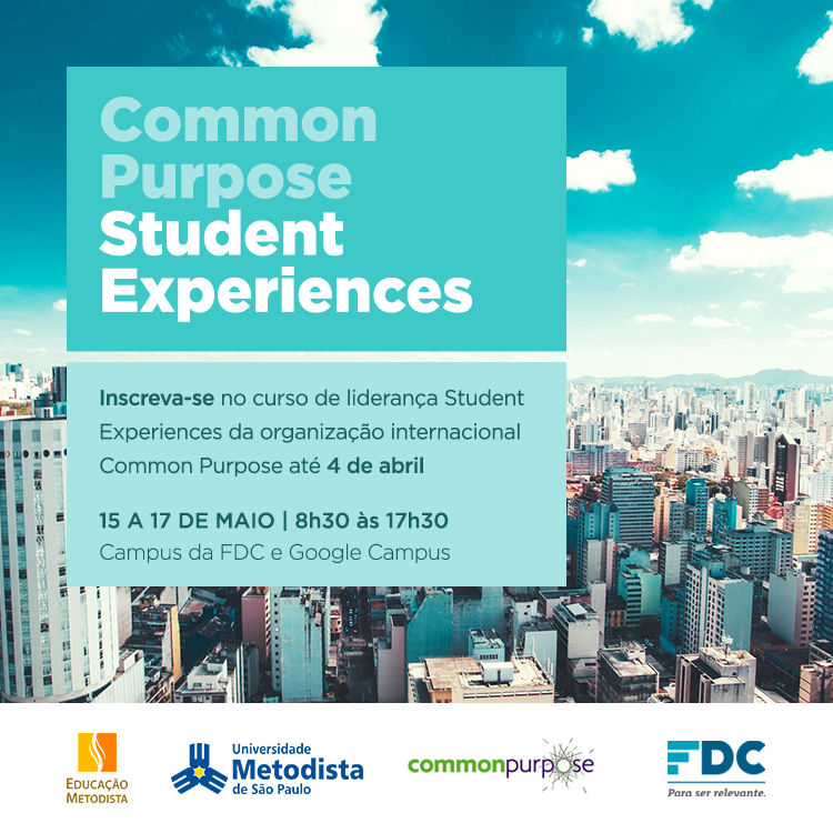 A Universidade Metodista de São Paulo foi convidada para participar do curso de liderança Student Experiences oferecido pela organização internacional Common Purpose em parceria com a Fundação Dom Cabral. Essa é a primeira vez que o curso será realizado em São Paulo e a Metodista foi uma das oito Instituições de Ensino Superior selecionadas.