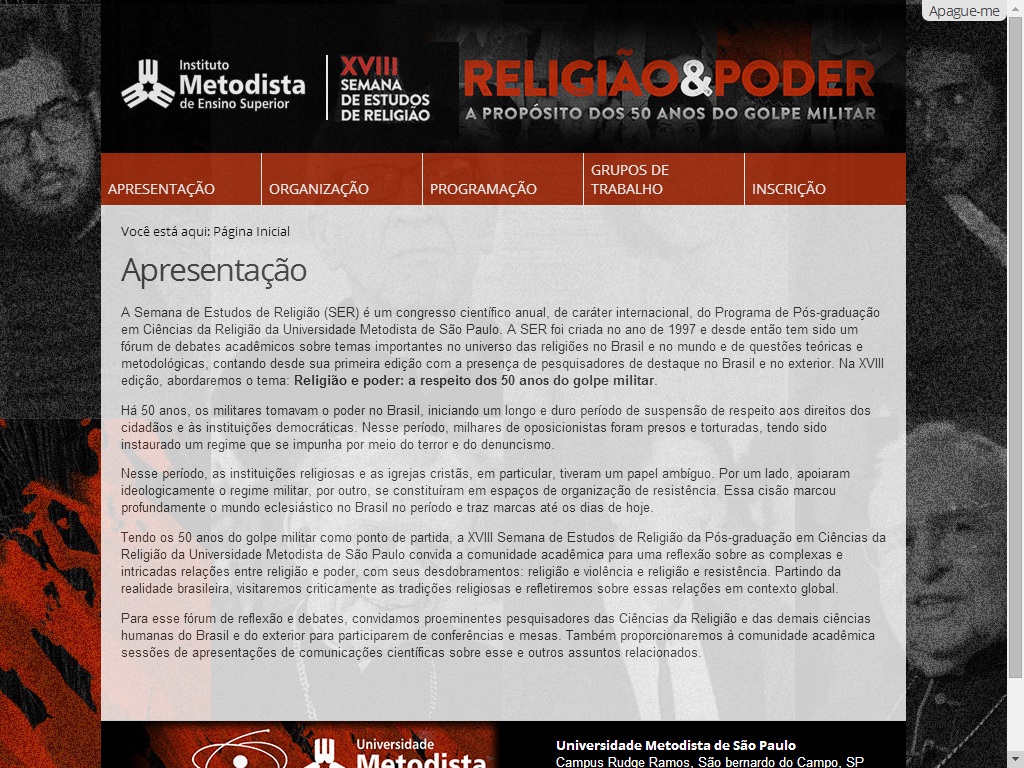 A XVIII Semana de Estudos de Religião (SEI), evento científico internacional, terá como tema “Religião & Poder: a respeito dos 50 anos do golpe militar”. A Semana contará com conferências, mesas, lançamentos de livros e apresentações de trabalhos acadêmicos, que acontecerão entre os dias 23 a 25 de setembro. O evento é organizado pelo Programa de Pós-Graduação em Ciências da Religião (PPGCR).