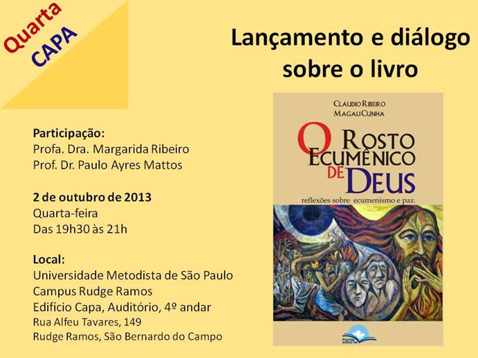 O livro, escrito escrito conjuntamente com o docente Claudio Ribeiro, trata sobre o Ecumenismo e a paz entre as religiões. O lançamento da publicação será no dia 2 de outubrode 2013, quarta-feira, e contará também com um diálogo com a presença dos professores Margarida Ribeiro e Paulo Ayres Mattos. O evento será no Campus Rudge Ramos, da Umesp, no auditório do Ed. Capa, às 19h30.