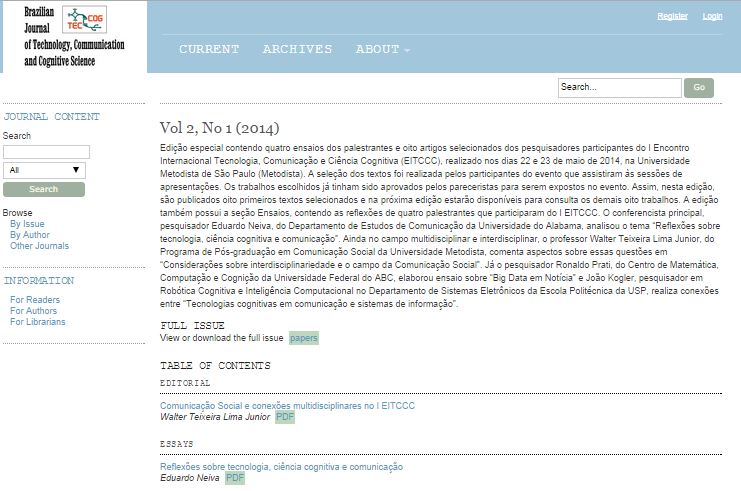 A Brazilian Journal of Tecnology, Communication, and Cognitive Science, produzida pelo grupo de pesquisa do POSCOM Tecnologia, Comunicação e Ciência Cognitiva, lançou o seu segundo número com a edição especial contendo quatro ensaios dos palestrantes e oito artigos selecionados dos pesquisadores participantes do I Encontro Internacional Tecnologia, Comunicação e Ciência Cognitiva (EITCCC), realizado nos dias 22 e 23 de maio de 2014, na Universidade Metodista de São Paulo (Metodista).
