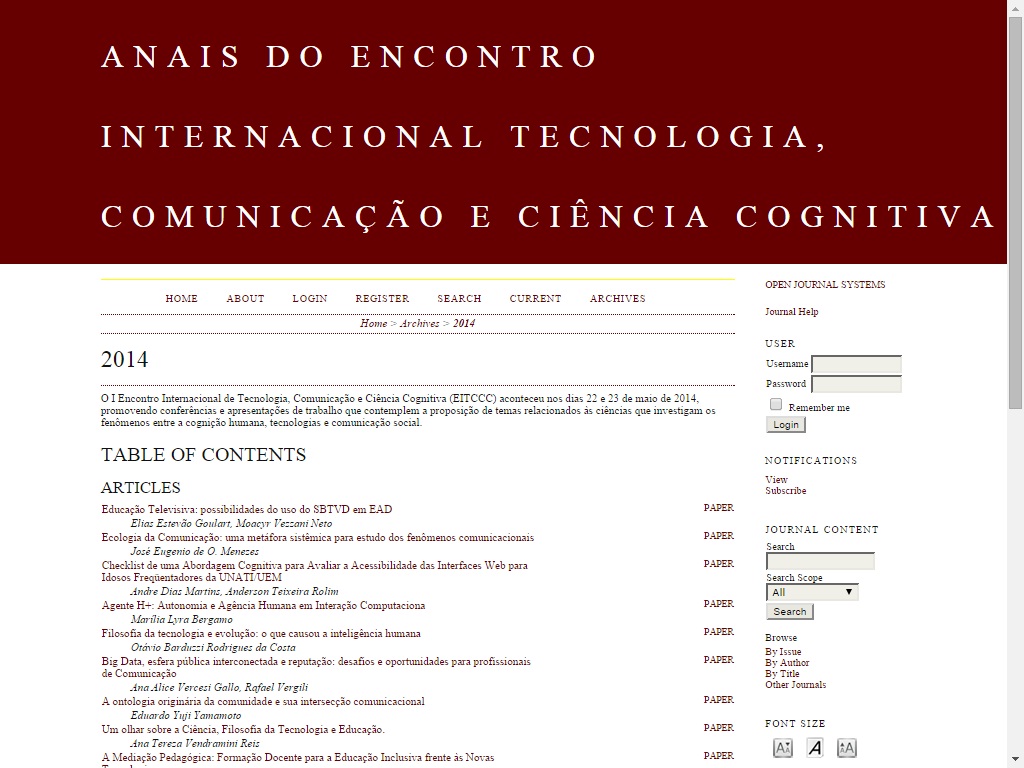 Os anais do I Encontro Internacional Tecnologia, Comunicação e Ciência Cognitiva (I EITCCC), realizado nos dias 22 e 23 de maio na Universidade Metodista, já estão on-line. O evento foi promovido pelo Grupo de Pesquisa Tecnologia, Comunicação e Ciência Cognitiva (Tecccog), pertencente ao Programa de Pós-graduação em Comunicação Social.