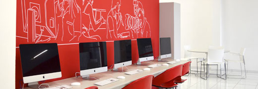 Espaço para Projetos Experimentais com 34 iMacs de 8 Gb de memória, 16 escritórios, salas de atendimento, SmartTVs e impressoras