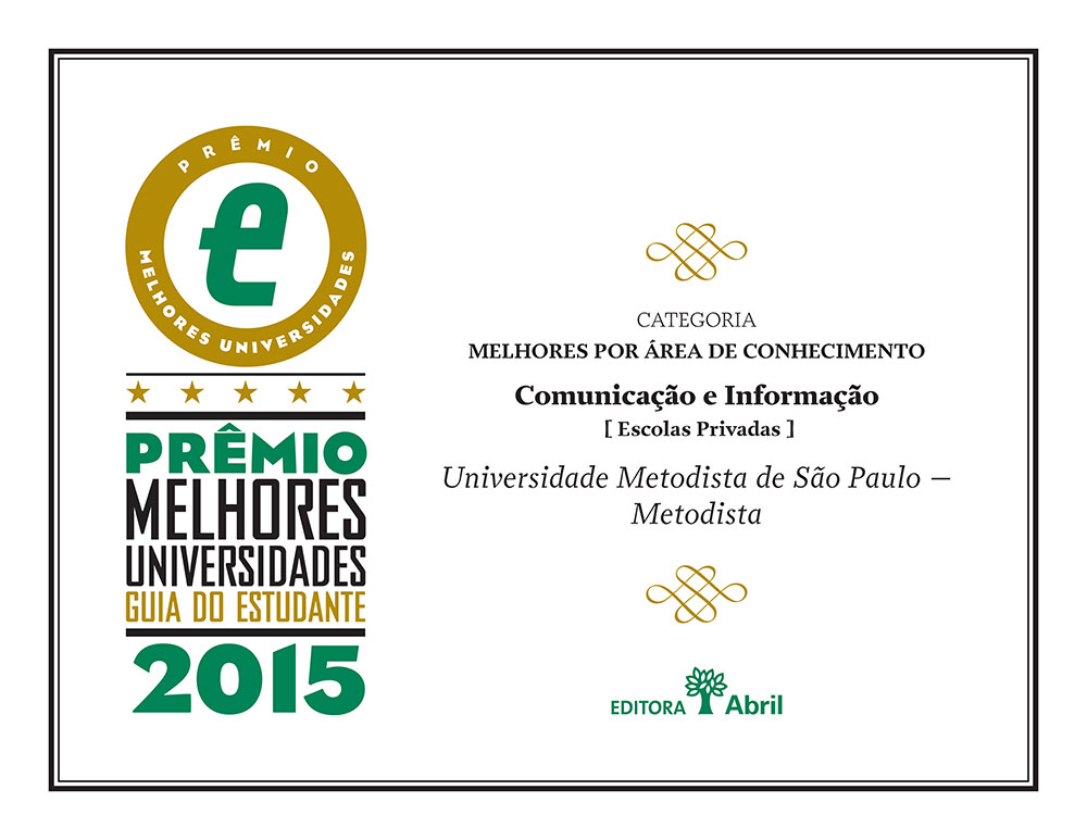 Não é tão simples ser seis vezes a melhor universidade privada do segmento Comunicação e Informação do Brasil. A Universidade Metodista de São Paulo realizou este feito. Novamente, a Instituição conquistou o reconhecimento nesta categoria no Prêmio Melhores Universidades Guia do Estudante – 2015, da Editora Abril. Os demais prêmios foram conquistados em cinco anos consecutivos, de 2009 a 2013 e agora em 2015, volta a ser a número 1.
