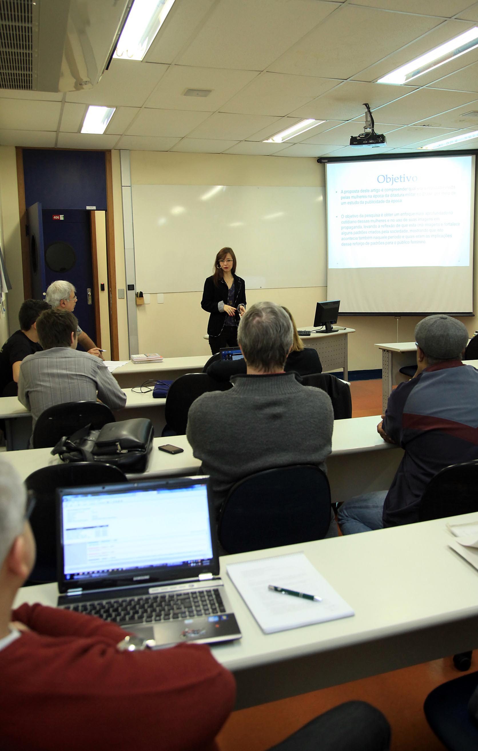 Aluna do programa de Pós-Graduação em Comunicação Social apresentando o seu trabalho.