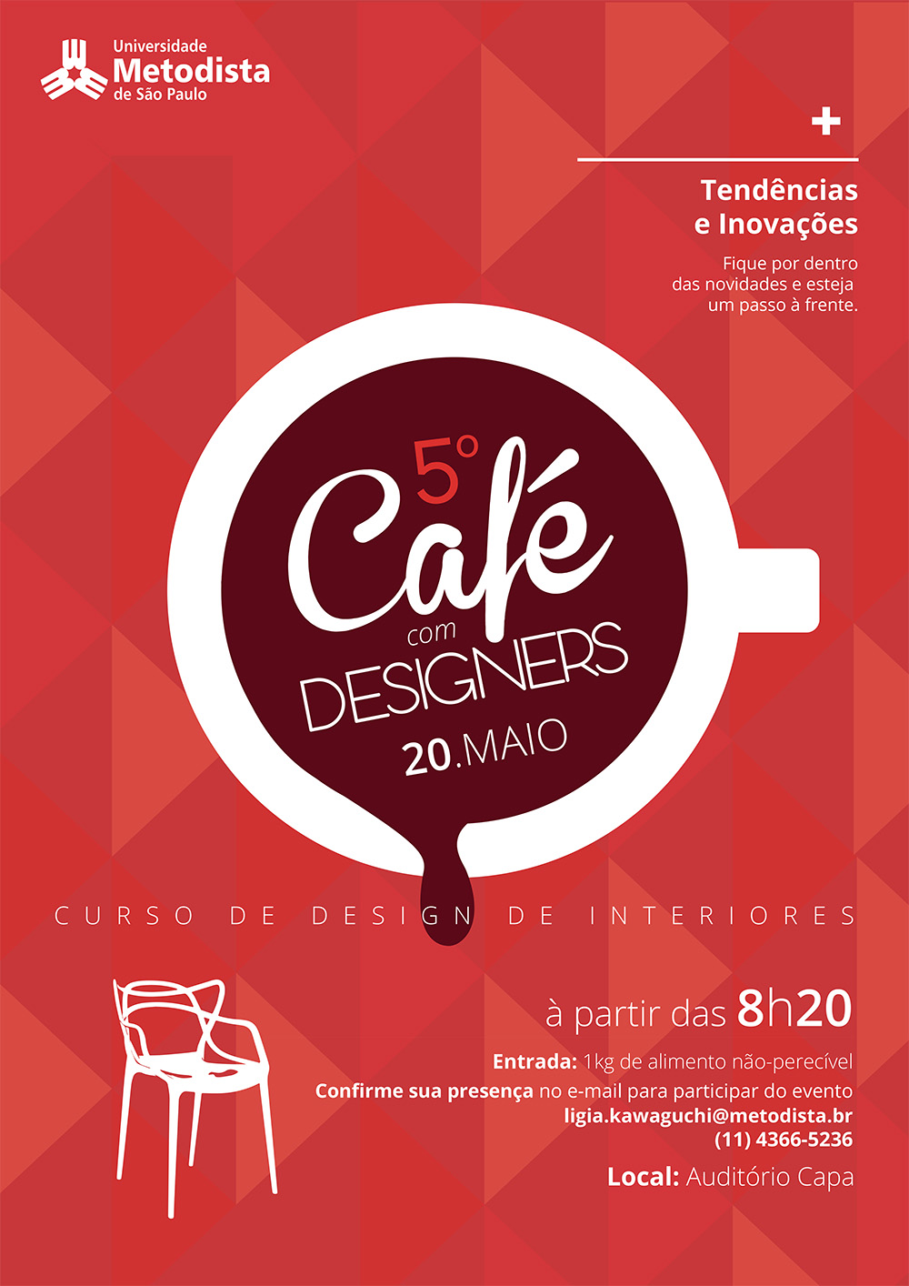 O curso de Design de Interiores da Universidade Metodista de São Paulo promove, no dia 20 de maio, às 8h20, o “Café com Designer”, evento que proporciona palestras com profissionais renomados que discutirão questões sobre o mercado de Designer de Interiores e abre espaço para diálogo entre os alunos, professores e palestrantes. Este ano, o evento tem como tema trabalhar “tendências e inovações”.