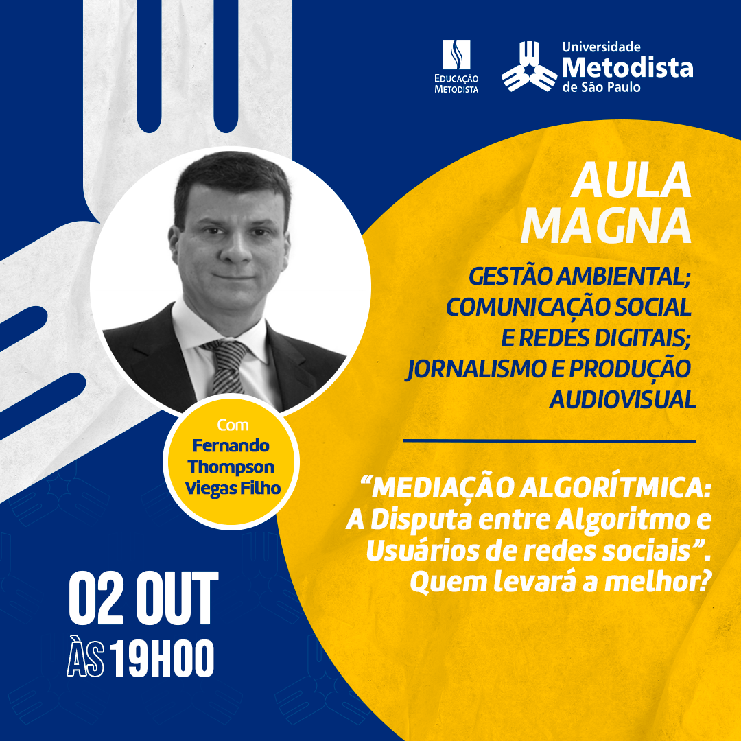 Mediação Algorítmica: A Disputa entre Algoritmo e Usuários de Redes Sociais. Quem Levará a Melhor? estará em debate neste 2 de outubro a partir das 19h com o jornalista Fernando Thompson Viegas Filho, durante aula magna dos cursos de Gestão Ambiental, Comunicação Digital e Redes Sociais, Jornalismo e Produção Audiovisual da Educação a Distância Metodista.