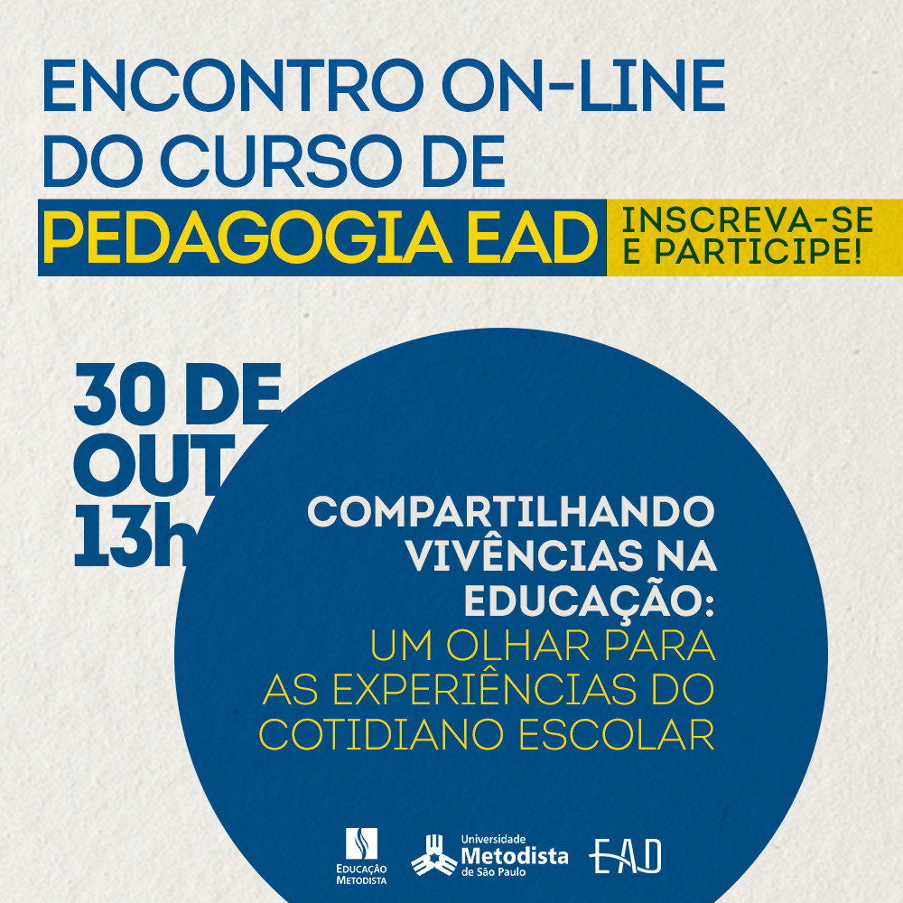 Com o tema "Compartilhando vivência da educação: um olhar para as experiência do cotidiano escolar", no dia 30 de outubro próximo acontece o encontro on-line organizado por estudantes do curso de Pegagogia EAD e alunas egressas do curso da Universidade Metodista de São Paulo.