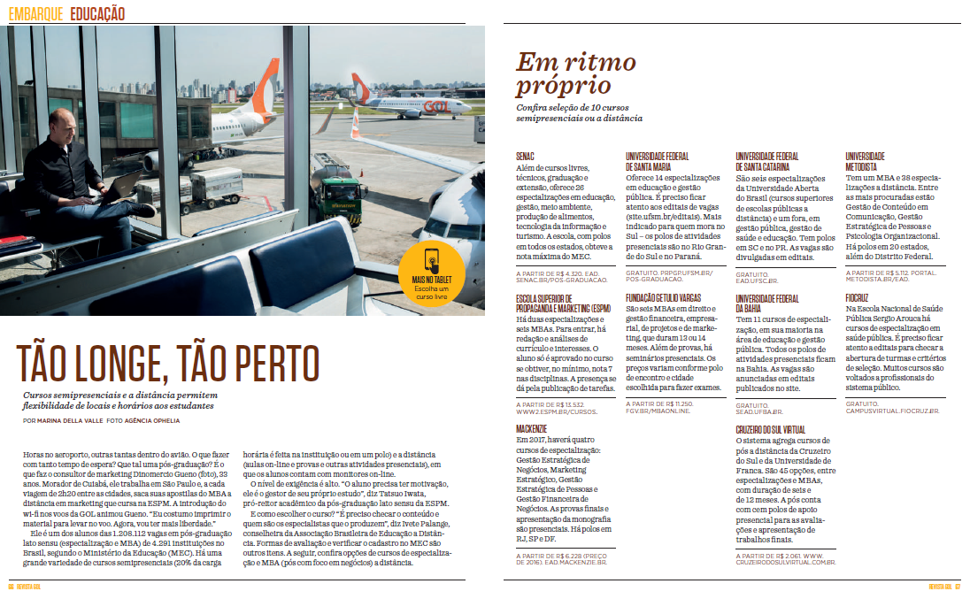 Com a necessidade de continuar os estudos, mas sem tempo para cursos presenciais, muitas pessoas aderem aos cursos a distância. A Revista Gol, disponibilizada aos passageiros que voam com a companhia, enfatizou as vantagens dos cursos EAD e destacou a ampla oferta da Universidade Metodista de São Paulo.