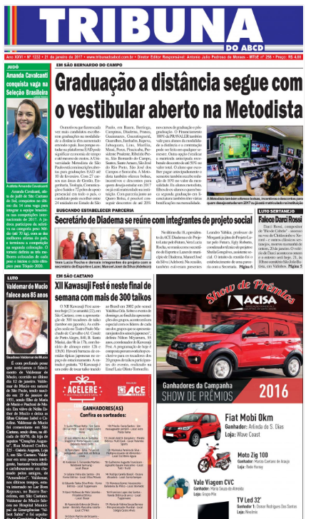 O jornal Tribuna do ABCD, que circula em quatro cidades do ABC paulista, trouxe como manchete (principal notícia da 1ª página) as inscrições abertas para o Vestibular 2017 da Educação Metodista a Distância. A edição é de 21 de janeiro último. Veículo que vai às bancas semanalmente na forma impressa e diariamente na plataforma digital, a Tribuna do ABCD tem abordagem jornalística regional voltada às pautas de poderes públicos e da comunidade.