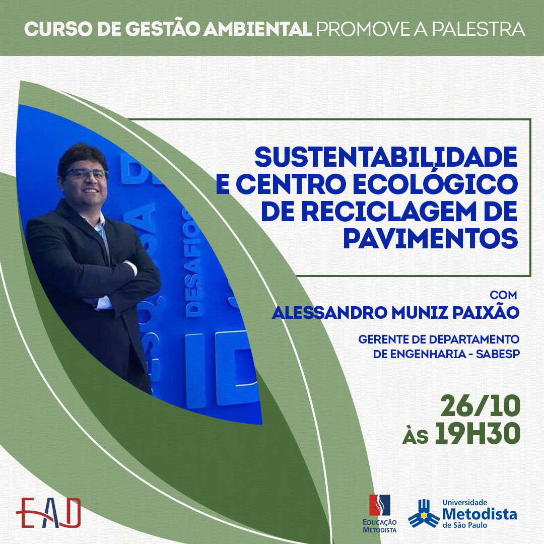 No dia 26 de outubro, às 19h30, o curso de Gestão Ambiental EAD recebe o Gerente de Departamento da Sabesp, Alessandro Muniz Paixão, para falar sobre “Sustentabilidade e Centro Ecológico de Reciclagem de Pavimentos”.