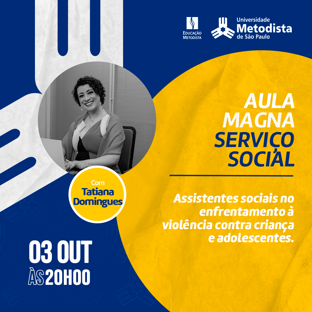 O curso de Serviço Social EAD da Universidade Metodista de São Paulo terá aula magna neste 3 de outubro, às 20h, com a temática "Assistentes sociais no enfrentamento à violência contra criança e adolescentes", ministrada pela professora Tatiana Domingues.