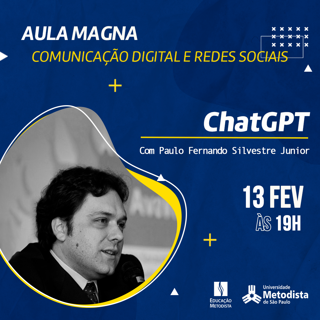 O curso de Comunicação Digital e Redes Sociais EAD agendou magna on-line na noite de 13 de fevereiro de 2023, às 19h, com o tema “ChatGPT”, palestrada pelo jornalista Paulo Fernando Silvestre Junior.