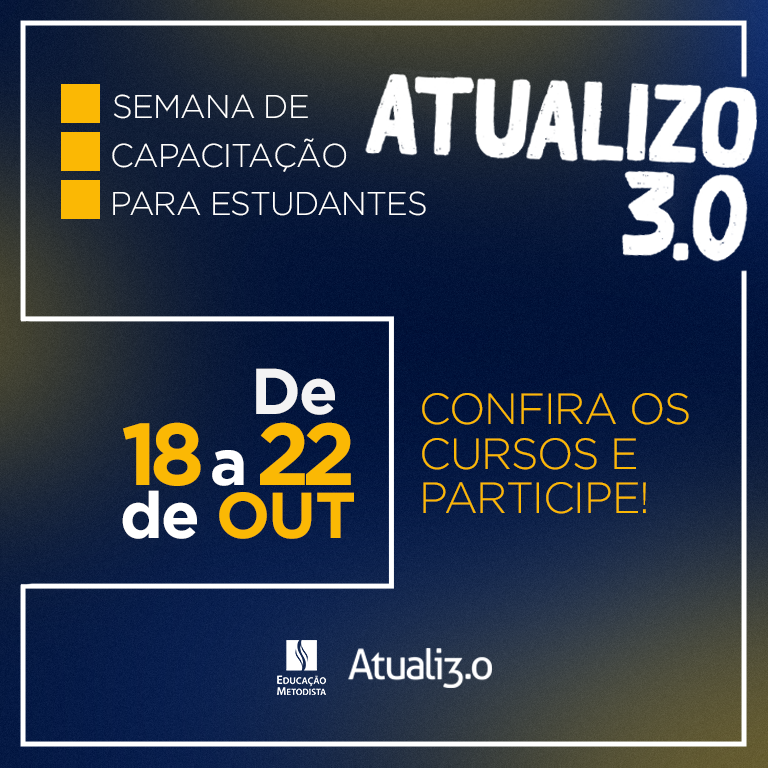 No período de 18 a 22 de outubro, a Universidade Metodista de São Paulo convida todos os seus alunos para participar da primeira edição da "Atualizo 3.0", semana de capacitação que oferece cursos de formação complementar.