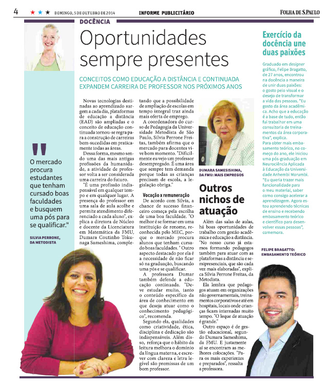 Na edição do dia 05 de outubro, a Folha de S. Paulo publicou um caderno contendo uma matéria especial sobre o mercado e carreira de docentes e como conceitos como, Educação a Distância e Continuada podem colaborar com a expansão da carreira.