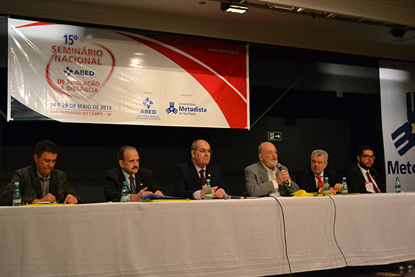 A mesa de abertura contou com os professores Paulo Borges Campos Júnior, reitor da Metodista; Fredric Michael Litto, presidente da Associação Brasileira de Educação a Distância (ABED); Paulo Antonio Gomes Cardim, reitor do Centro Universitário Belas Artes; Nelson Boni, presidente do Grupo Educamais; Eduardo Penna de Sá, coordenador nacional da área de ensino da Educação Metodista; e Marcio Oliverio, diretor de Educação a Distância da Universidade Metodista.