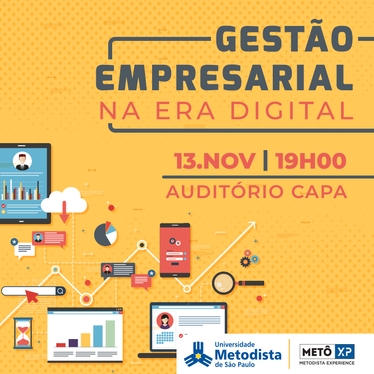 A Universidade Metodista de São Paulo, por meio da programação da Metô XP, promove a palestra “Gestão Empresarial na Era Digital”, no próximo dia 13 de novembro, às 19h, no Auditório Capa.