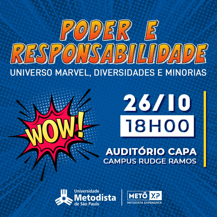 Como parte da programação do Metô XP, a Universidade Metodista de São Paulo promove, no dia 26 de outubro, às 18h, no auditório Capa, a palestra “Poder e Responsabilidade: Universo Marvel, Diversidades e Minorias”.