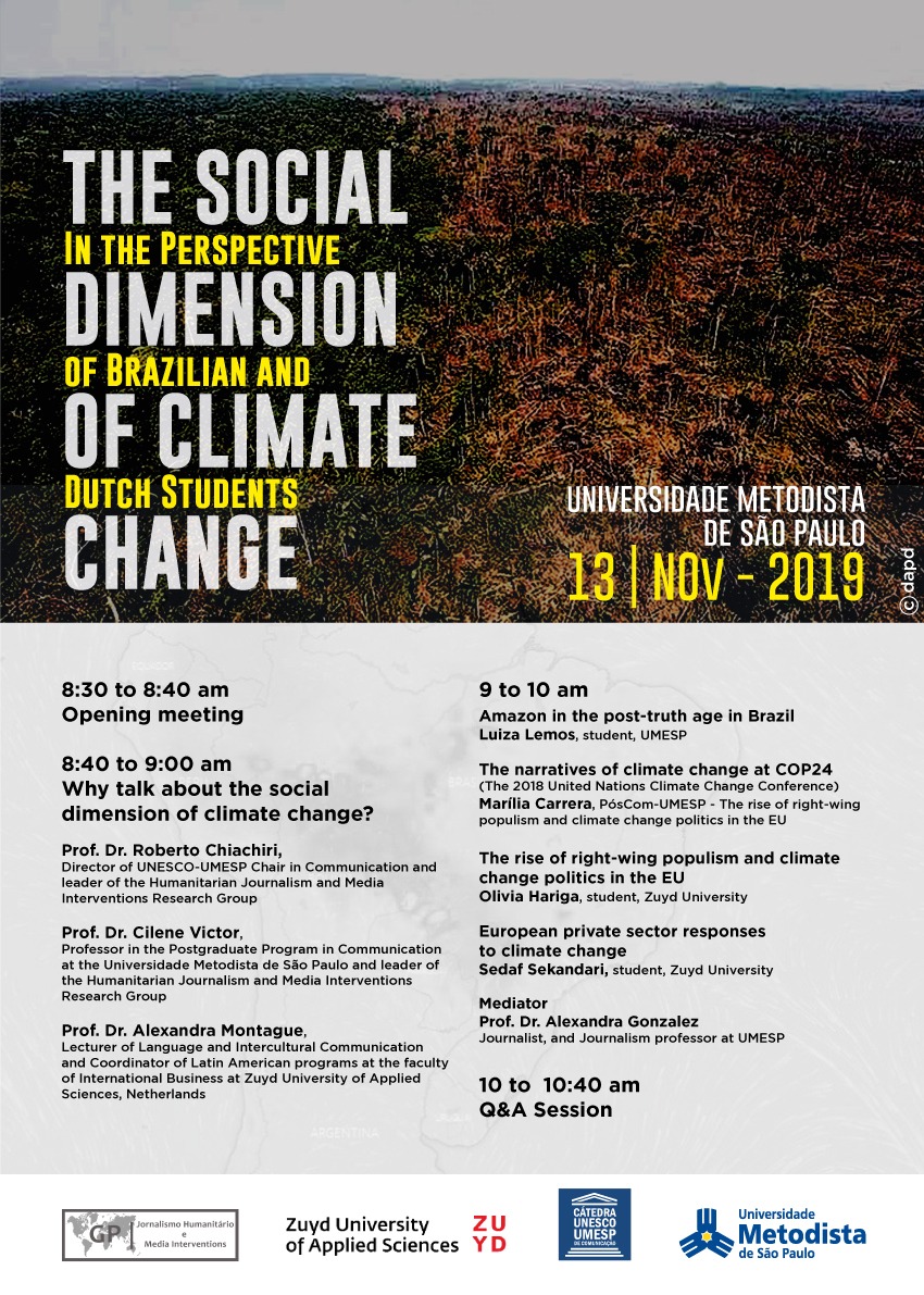 A Universidade Metodista de São Paulo convida os alunos dos cursos de Engenharia Ambiental, Direito, Administração, Jornalismo e Publicidade e Propaganda para uma discussão sobre a Dimensão Social das Mudanças Climáticas.