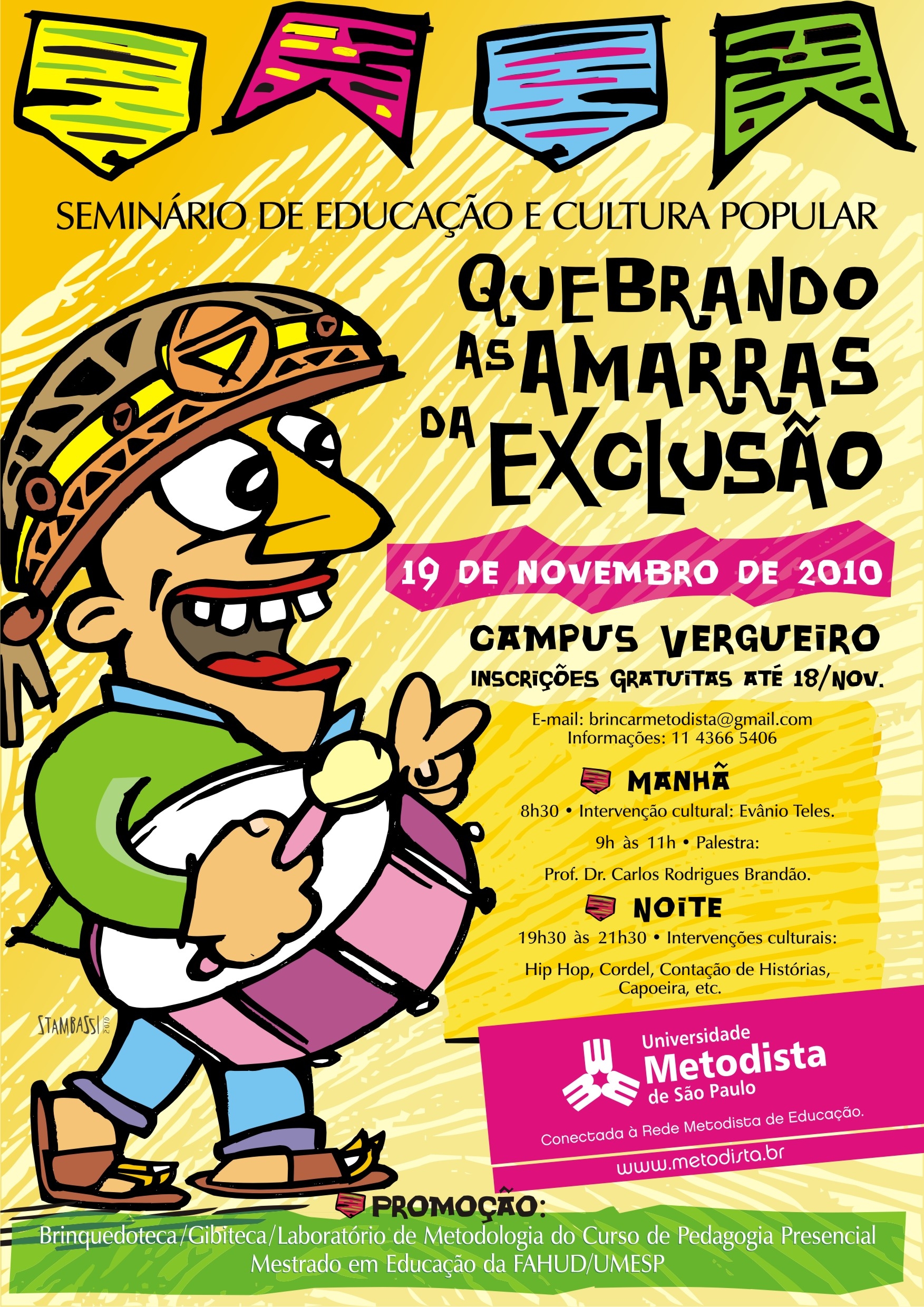No próximo dia 19 de novembro, a Faculdade de Humanidades e Direito da Universidade Metodista de São Paulo, por meio da “Brinquedoteca do Curso de Pedagogia Presencial” e do “Mestrado em Educação”, realizará o Seminário “Educação e cultura popular: quebrando as amarras da exclusão social”.