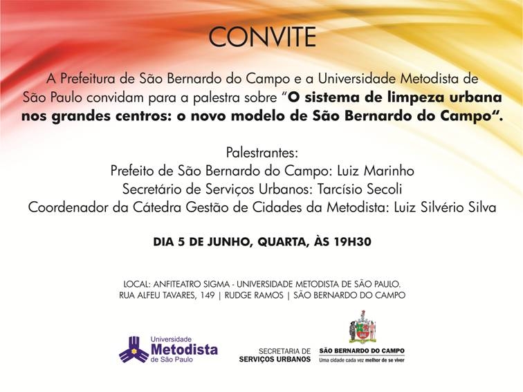 A Universidade Metodista de São Paulo e a Prefeitura de São Bernardo do Campo promovem, nesta quarta-feira (05), a palestra “O sistema de limpeza urbana nos grandes centros: o novo modelo de São Bernardo do Campo”.