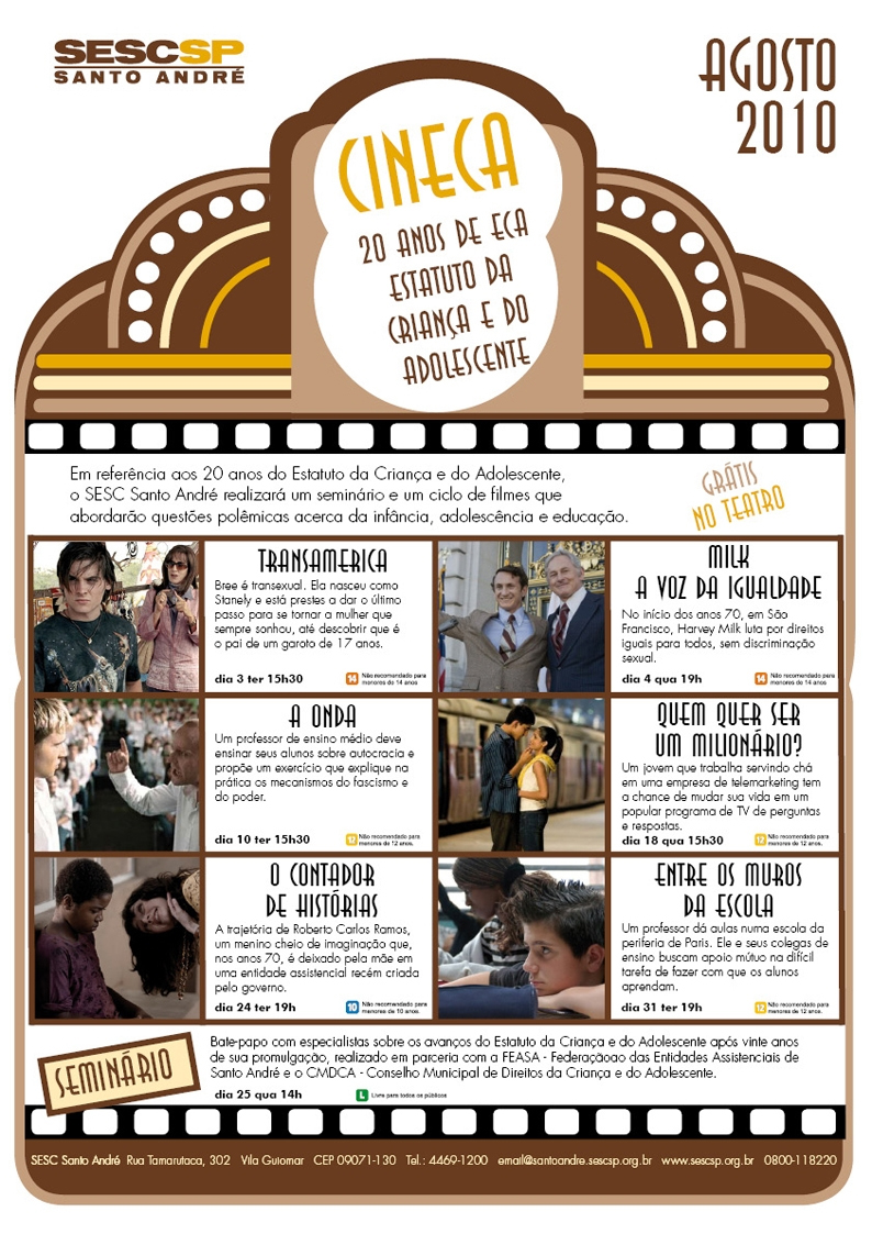 O SESC – Santo André promove agora, no mês de agosto, a CINECA - 20 Anos de Estatuto da Criança e do Adolescente. Faz parte da programação sessões de filmes e seminários que debatem os 20 anos do estatuto.
