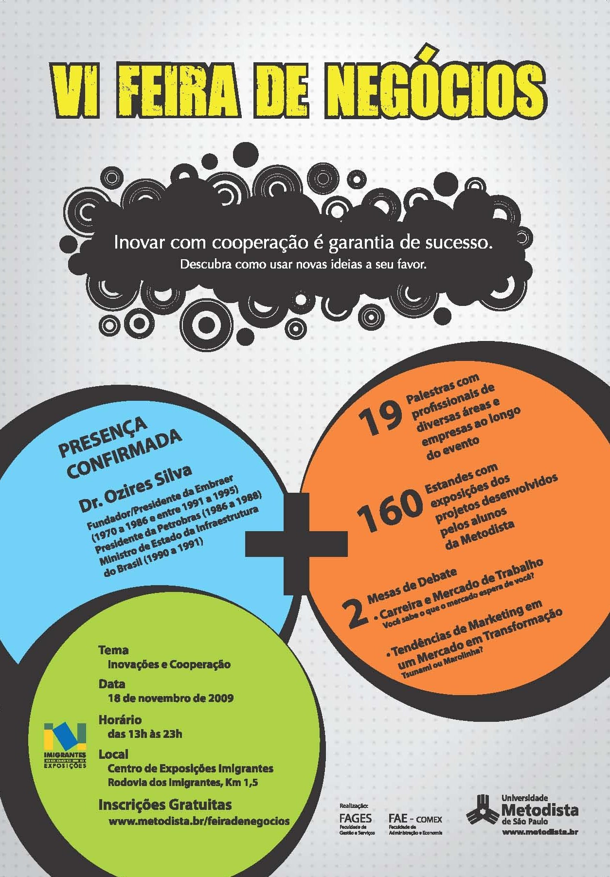 No dia 18 de novembro, a Faculdade de Gestão e Serviços (FAGES) e a Faculdade de Administração e Economia (FAE) da Metodista promovem a VI Feira de Negócios, que neste ano aborda o tema Inovações e Cooperação.