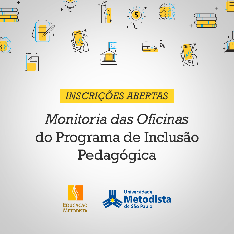 Estão abertas as inscrições para monitoria das oficinas oferecidas pelo Programa de Inclusão Pedagógica. Para participar, basta encaminhar nome completo, número de matrícula, curso no qual está matriculado e a oficina que deseja monitorar para o e-mail monitoriaead@metodista.br até 17 de março de 2017.