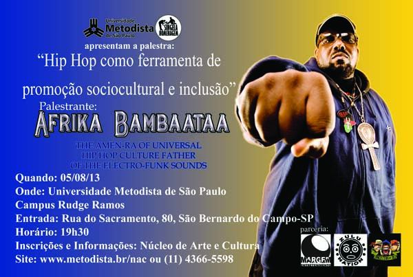 A Universidade Metodista de São Paulo recebe no próximo dia 05 de agosto, às 19h30 o DJ Afrika Bambaataa, que dará a palestra: “Hip Hop como ferramenta de promoção social cultural e inclusão”. O evento é uma parceria com o Festival Singela Homenagem Hip Hop e acontecerá no Salão Nobre e terá transmissão ao vivo no Anfiteatro Sigma. A palestra é gratuita e aberta ao público, porém os interessados devem se inscrever previamente pelo site.