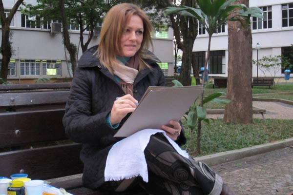 O movimento das pinceladas no papel reciclado segue o olhar atento da artista plástica. Mas se você pensa que o resultado final será um retrato fiel, Sueli avisa: “Não espere algo todo certinho. Eu busco a essência e, com tinta, a expressividade é maior”.