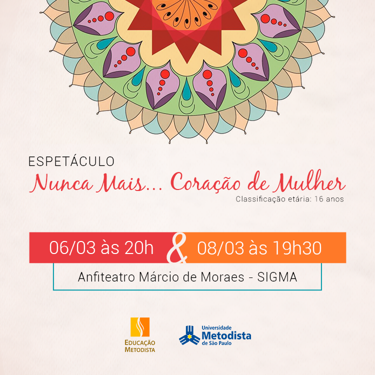Em celebração ao Dia Internacional da Mulher, comemorado em 8 de março, o Núcleo de Arte e Cultura promove o espetáculo teatral da Companhia O Tom da Graça: “Nunca Mais...Coração de Mulher”, que será apresentado nos dias 6 e 8 de março de 2017, às 20h e às 19h30, respectivamente, no Anfiteatro Marcio de Moraes - Campus Rudge Ramos.