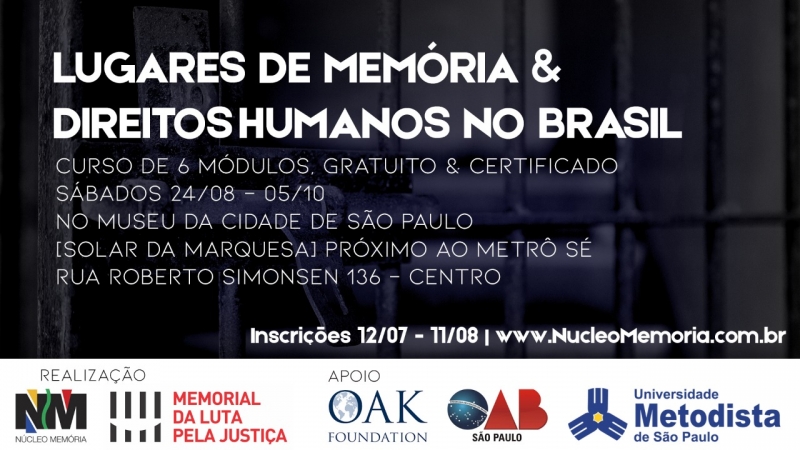 O Núcleo Memória, parceiro do Núcleo de Formação Cidadã da Universidade Metodista de São Paulo, realiza o curso “Lugares de Memória e Direitos Humanos no Brasil”, que ocorrerá aos sábados de 24 de agosto a 05 de outubro no Museu da Cidade de São Paulo. As inscrições são gratuitas e devem ser feitas até 11 de agosto, no site da instituição realizadora. As vagas são limitadas.
