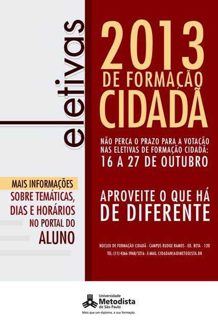 O período para eleição das disciplinas que serão oferecidas no primeiro semestre de 2013 vai de 16 a 27 de outubro de 2012. A votação deve ser feita pelo Portal do Aluno (www.metodista.br), onde é possível encontrar a relação completa das temáticas, dias e horários.