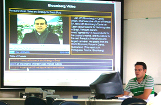Os alunos do curso de Pós-Graduação em Comunicação receberam no dia 6 de março, a visita do jornalista e ex-aluno da Metodista, Daniel de Castro. Daniel, que se formou em 1997, voltou à Universidade para contar um pouco de sua experiência na TV Bloomberg e sobre o B-Unit, uma tecnologia que disponibiliza informações do terminal da Bloomberg na internet.