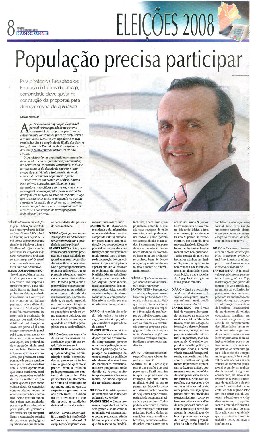 A participação da população é essencial para obtermos qualidade no sistema educacional. As propostas precisam ser coletivamente construídas junto de professores e a comunidade necessita acompanhar e cobrar resultados. Essa é a opinião de Elydio dos Santos Neto, diretor da Faculdade de Educação e Letras da Universidade Metodista de São Paulo.