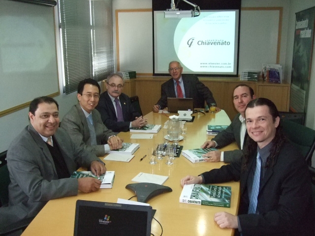 Quatro docentes da Universidade Metodista de São Paulo participaram da reunião, que ocorreu dia 17 de junho, no Instituto Chiavenato, para tratar da reformulação da obra Introdução à Teoria Geral da Administração: o coordenador do curso de Administração Geral, professor Almir Martins Vieira; o coordenador de Administração em Comércio Exterior, professor João Almeida Santos; o coordenador de Administração Financeira, professor Alberto de Oliveira Silva Filho; e o professor Marcos Antonio Lopes Picon.