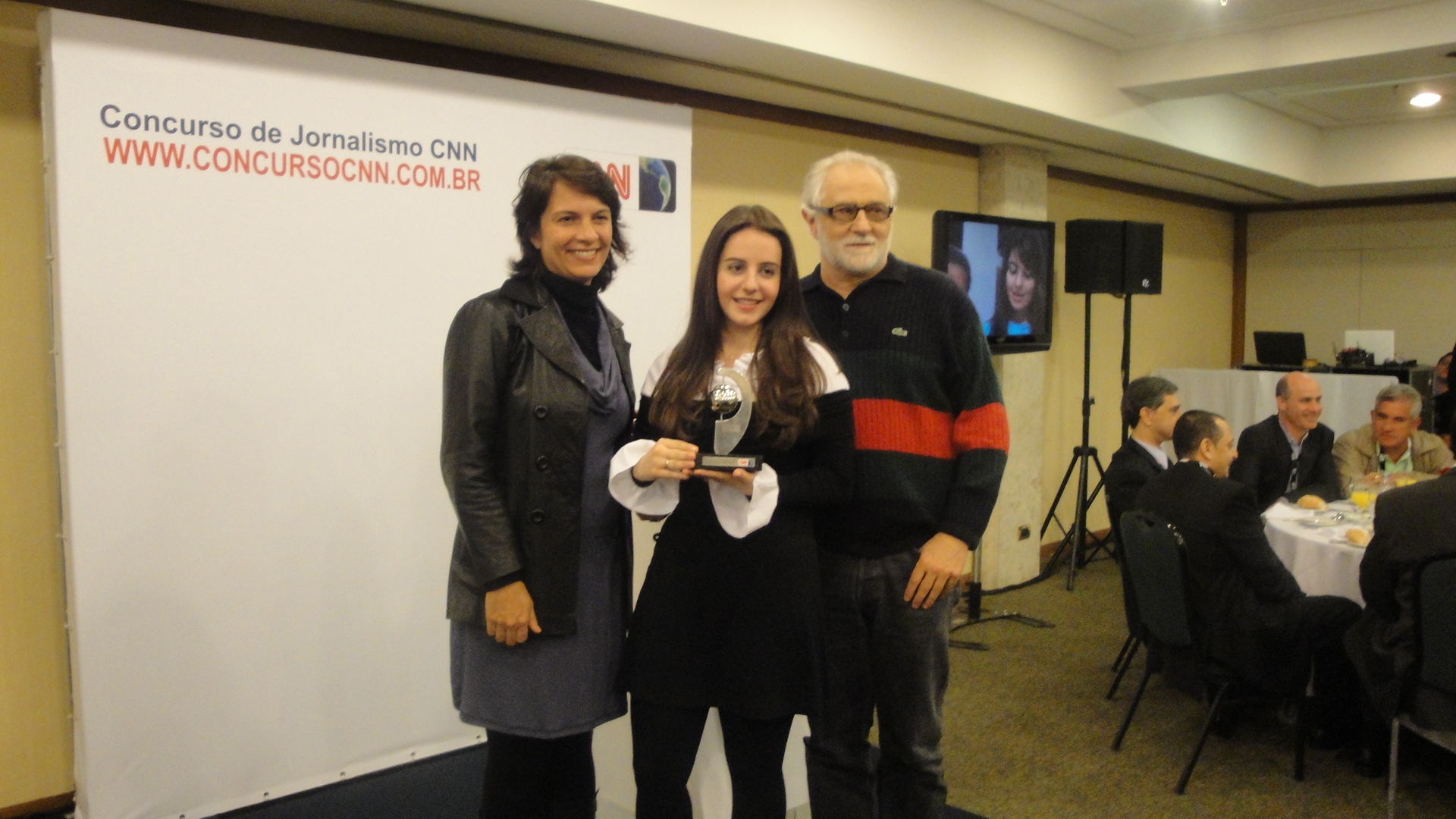 A estudante Carolina Ianelli e os professores Rodolfo Martino e Heidy Vargas, na premiação do concurso jornalismo universitário CNN. Foto: Arquivo pessoal