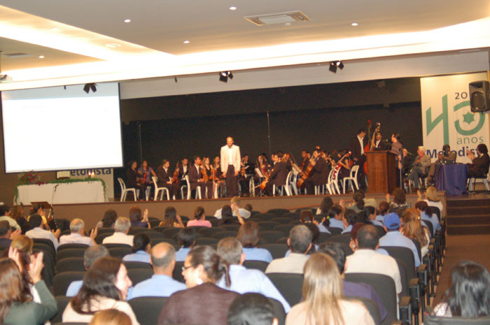 A acolhida seguiu com a palavra do reitor da Metodista, professor Marcio de Moraes. “Neste momento de acolhida, quero dar as boas vindas a todos. Este é um momento de felicidade, estamos alegres por estarmos juntos. Agradeço aos presentes, ao Coral da Faculdade de Teologia e a Orquestra”.