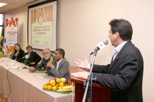 A mesa principal foi composta pelo prefeito Luiz Marinho, a secretária de Desenvolvimento Social e Cidadania, Márcia Barral, o consultor técnico da divisão de alimentação da Secretaria Municipal de Educação, João Tadeu Pereira, o vereador José Ferreira e a munícipe Barbara Fernandes Coelho.