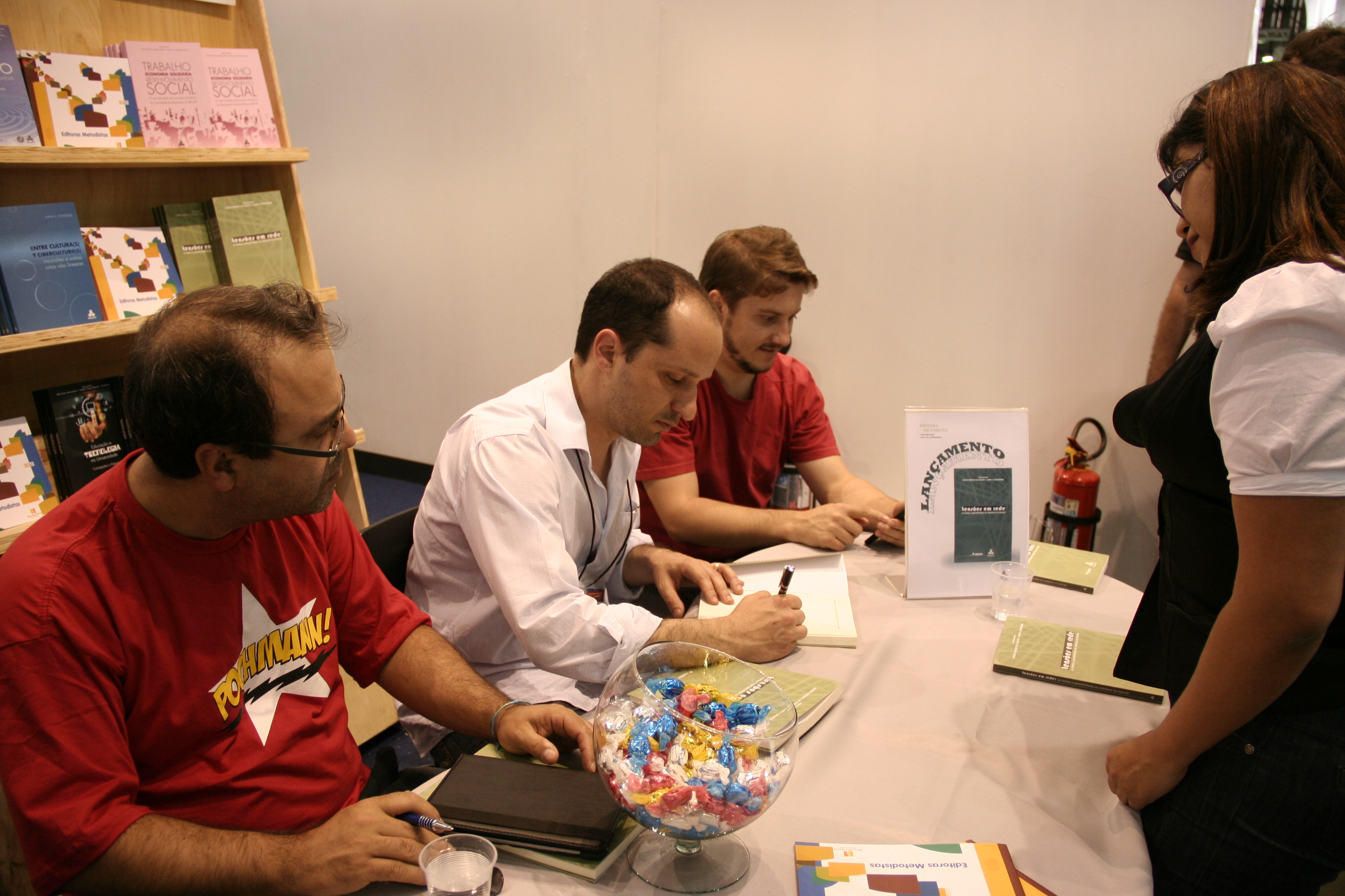 Professor Fabio Josgrilberg (ao centro) junco de Sergio Amadeu da Silveira e Rodrigo Savazoni em sessão de autógrafos durante lançamento do livro Tensões em rede - Crédito: Mônica Rodrigues