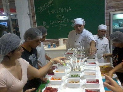 Os visitantes que passam pelo estande da Universidade na Feira do Guia do Estudante, que acontece no pavilhão amarelo do Expocenter Norte de hoje (24) a domingo (26), têm a oportunidade de participar da oficina Anatomia dos Canapés, ministrada por alunos do 4°semestre de Gastronomia.