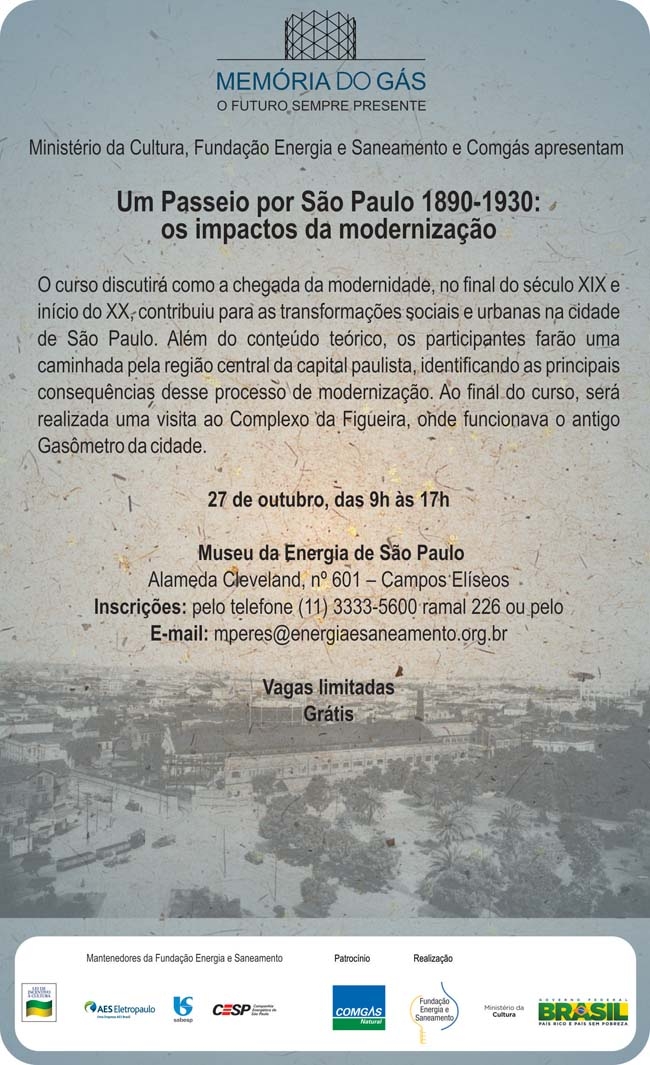 O Ministério da Cultura, a Fundação Energia e Saneamento e a Comgás promovem, no próximo sábado (27), a oficina “Um passeio por São Paulo: 1890-1930: os impactos da modernização”.
