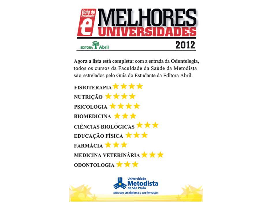 A área de Biológicas e Saúde da Universidade Metodista de São Paulo está em destaque. Todos os cursos avaliados receberam estrelas na edição 2013 da revista O Guia do Estudante da Editora Abril, principal veículo de publicação de Instituições de Ensino Superior do país.