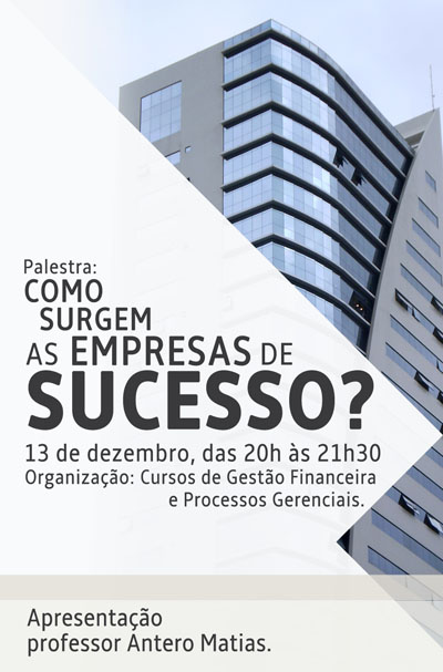 Os cursos a distância de Gestão Financeira e Processos Gerenciais promovem, no dia 13 de dezembro, às 20h, a palestra “Como surgem as empresas de sucesso?”, com o professor Antero Matias, especialista em Gestão de Serviços e mestre em Administração de Empresas.
