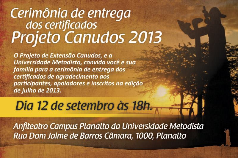 Nesta quinta-feira, 12 de setembro, o Projeto Canudos e a Universidade Metodista de São Paulo promovem a cerimônia de entrega de certificados e agradecimento aos participantes, apoiadores e inscritos na edição de julho de 2013.