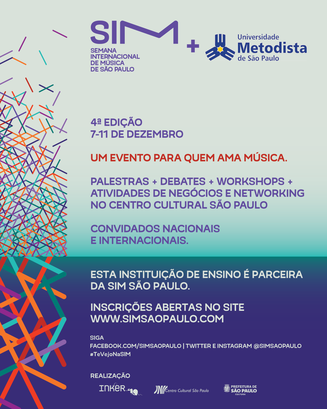 A Universidade Metodista de São Paulo é parceira da 4ª edição da Semana Internacional de Música de São Paulo (SIM São Paulo). O evento, que será realizado de 7 a 11 de dezembro de 2016, já é considerado um dos mais importantes music conventions, ou feiras de negócios da música, da América Latina.