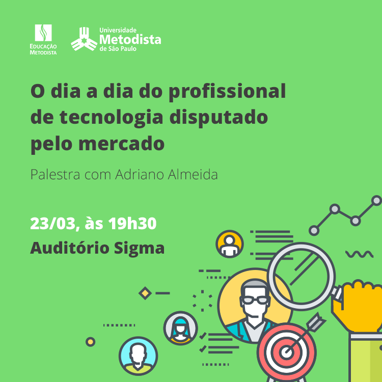 A Universidade Metodista de São Paulo, por meio da Escola de Engenharias, Tecnologia e Informação, e em parceria com a Alura, promove a palestra “O dia a dia do profissional de tecnologia disputado pelo mercado”, com Adriano Almeida, diretor comercial da Alura. O encontro acontece no dia 23 de março de 2017, às 19h30, no Anfiteatro Marcio de Moraes, localizado no Edifício Sigma do Campus Rudge Ramos.