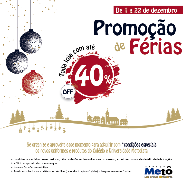 Já começou a Promoção de Férias das lojas Espaço Metô e Metô Books, do Centro de Convivência do campus Rudge Ramos, da Universidade Metodista de São Paulo. Até o dia 22 de dezembro, todos os itens estão com até 40% de desconto.