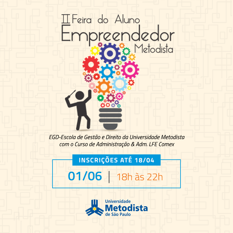 Para estimular o empreendedorismo dentro do espaço acadêmico, a Escola de Gestão e Direito da Universidade Metodista de São Paulo promoverá a II Feira do Aluno Empreendedor em junho deste ano.