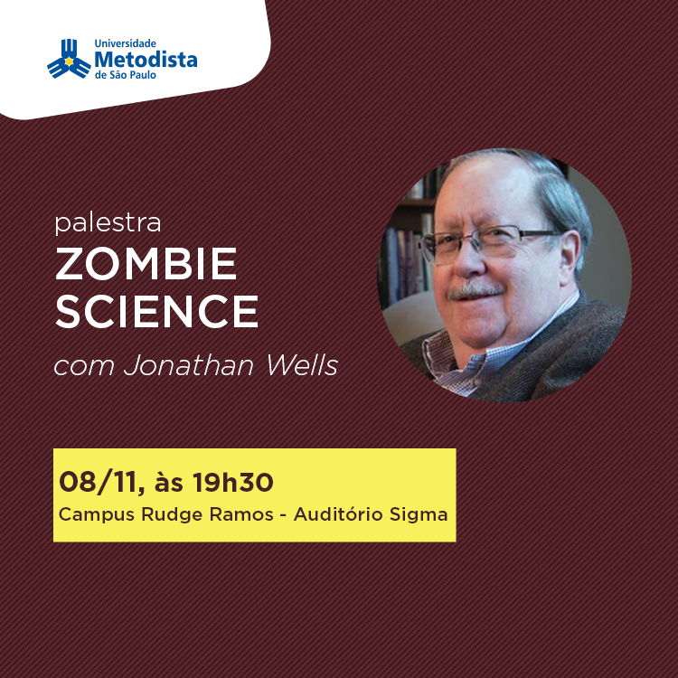 Na quarta-feira, 8 de novembro de 2017, a Universidade Metodista de São Paulo recebe o autor norte-americano Jonathan Wells, com a palestra “Zombie Science: a evolução e seus ícones”.